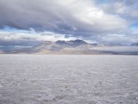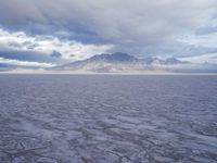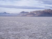 A dramatic winter scene of Salt Lake City, USA, showing the sun shining on the horizon over a tranquil lake and the surrounding mountain landforms. The ocean shore, freezing atmosphere, and icy tundra add to the natural environment of the city.