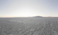 The sun rises over the rugged landscape of Salt Lake City in the US state of Utah, illuminating the icy lake and its surrounding mountains and desert. The clear sky is filled with a mix of blue and white clouds, creating an arctic atmosphere during the freezing winter months.