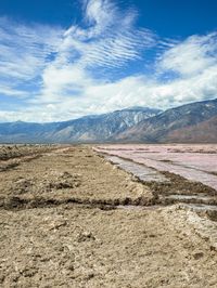 A view of an open salt surface in California, USA, under a cloudy day sky.