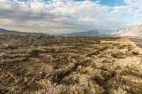 an expansive view of a desert on a cloudy day with mountains in the background as the sun shines on the mountains