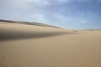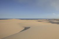 A stunning landscape of brown sandy dunes stretching across the vast open space of the Erg Desert, under a clear blue sky with no clouds in sight. The singing sand creates a unique desert experience as it shifts with the wind, creating a harmonious sound. The horizon seems endless, showcasing the beauty of nature's tints and shades on the surface of the desert. This Aeolian Landform is a geological phenomenon found in the mountain landforms, forming a mesmerizing terrain. The sandy hill and plateau offer a sunny and sunny day filled with sunshine.