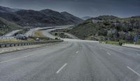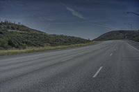 A picturesque view of a straight road winding through the Highland Mountains in California, USA, on a sunny day. The asphalt road surface with yellow lines stretches ahead, surrounded by breathtaking mountain landforms. The clear sky above creates a perfect backdrop for a road trip adventure.