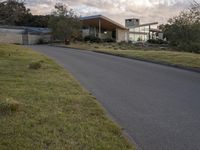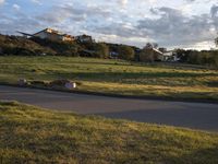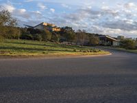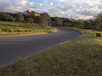 Beautiful view of a suburban residential area in California, USA with modern architecture, lush green grass, and a stunning sunrise over the mountains.