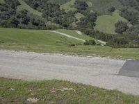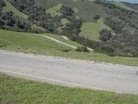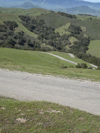 A picturesque view of the California countryside, showcasing the stunning mountain range, lush green grass, and a winding asphalt road under a clear blue sky.
