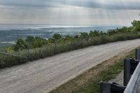 A breathtaking view of a coastal road surrounded by lush vegetation and overlooking the azure sea, with a guard rail and walkway for safety.