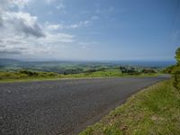A lush green landscape with a coastal road curving through the picturesque rural scenery