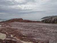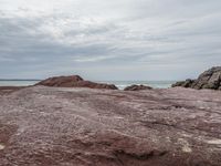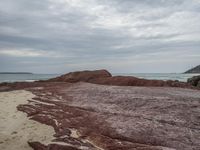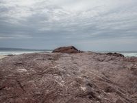 A stunning view of the rugged coastline along the Sapphire Coast in New South Wales, Australia. The grey sky and gloomy atmosphere add a dramatic touch to the rocky cliffs and outcrops. The open space and grassy terrain provide a perfect setting for recreational activities and off-road tracks. Take a moment to appreciate the natural beauty of this destination as waves crash against the bedrock and tree-clad mountains stand tall in the distance.