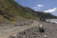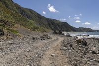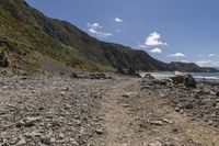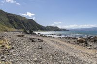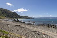 A breathtaking view of the coastal landscape in New Zealand, showcasing the rugged beauty of the North Island (Te Ika-a-Māui). The image features a combination of water, dirt, and wood, with a stunning mountain range in the background. The clear sky and straight road leading towards the horizon create a sense of adventure and exploration.