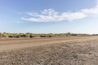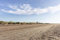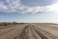 A beautiful coastal landscape in Spain with low sand dunes, clear blue water, and a dirt road leading into the horizon on a sunny day.