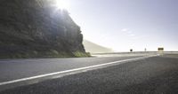 A low coastal road with paved asphalt surface winding through scenic mountains and rock walls, with clear sky and the sun visible, in Melbourne, Victoria, Australia.