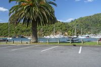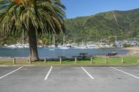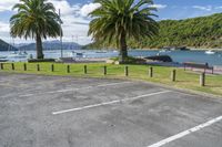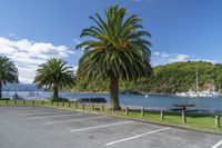 A beautiful coastal road lined with palm trees in Picton Foreshore Reserve, New Zealand, providing a perfect spot for leisure and recreation with stunning views of the ocean and lush greenery.