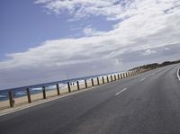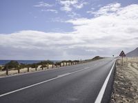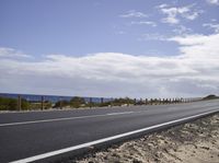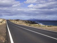 A beautiful road surrounded by nature and the ocean in Spain, Europe. The asphalt road stretches along the coastline, offering stunning views of the blue sea and sandy beaches. The clear blue sky with fluffy clouds adds to the picturesque landscape. This road trip on Fuerteventura island is a perfect way to explore the natural environment and enjoy the serene beauty of the sea and shore.