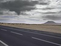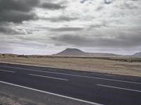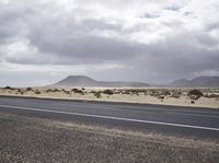 A beautiful coastal road in Spain, surrounded by the stunning landscape and nature of Fuerteventura. The road, made of asphalt, stretches along the coast, offering breathtaking views of the ocean and sandy beaches. The grey sky adds a touch of drama to the scene.