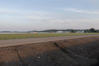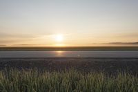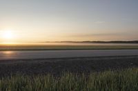 A low-lying asphalt road winds through the tranquil Canadian landscape with vast plains, green grass surfaces, and a calm sea in the distance under a clear sky at dawn.