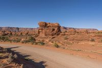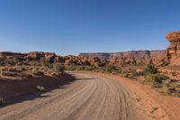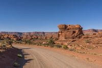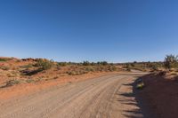 A low, rugged road winds through the sandy desert landscape of a national park, surrounded by wild trees and rock formations. The clear sky and mountain landforms create a stunning backdrop for this remote and rugged terrain.