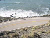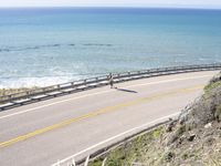 A beautiful view of the coastal road in California, USA, with the ocean on one side and lush green mountains on the other. The road surface is smooth asphalt, winding through the picturesque landscape with tall trees and grassy slopes. The elevated highway offers a top-down perspective of the Pacific Coast Highway, guarded by Armco barriers and yellow guard rails. The scenic route is perfect for a relaxing vacation, with stunning views of the sea, shore, and sandy beaches.