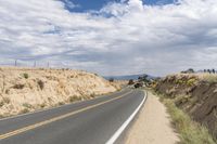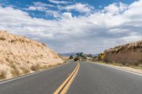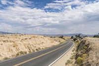 A straight road stretches through the low desert landscape of California, USA, with motion blur effect on a sunny day.