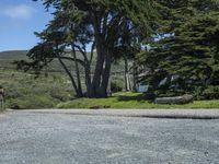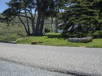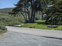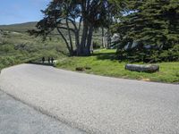 A low angle shot of a road surrounded by lush forest and grassy landscape in California, USA on a sunny day.