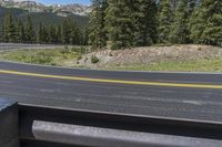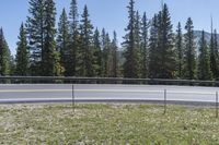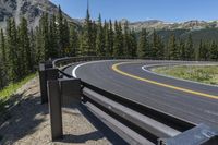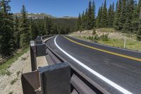 A picturesque road winds through the stunning landscape of Crested Butte, Colorado, surrounded by majestic mountains and lush forests. The clear sky above adds to the natural beauty, as the asphalt road stretches ahead, guarded by Armco barriers. Experience the high elevation and breathtaking views of Cottonwood Pass.