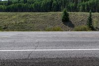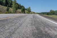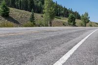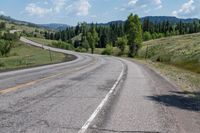 A straight road cuts through the green and lush landscape of Colorado, USA, as it winds its way through the forest. The road, lined with trees, curves gently and offers a picturesque view of the hills and clear blue sky. This scenic drive is located near Antonito and Chama, providing a profile view of the road as it stretches straight down the asphalt.