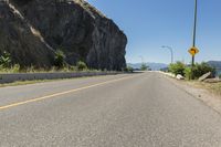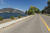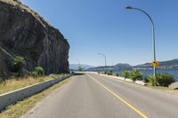 A picturesque view of a straight road cutting through the stunning landscape of Okanagan Valley in British Columbia, Canada. The road, lined with lush vegetation and towering mountains, runs parallel to the glistening Okanagan Lake. The clear blue sky overhead adds to the beauty of this natural environment. The Armco barriers and street lights along the road ensure safety as drivers navigate the sloping terrain and rocky walls. The Fintry Queen Steamboat can be seen in the distance, cruising along the calm waters of the lake.