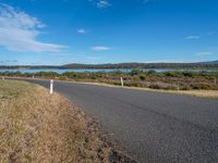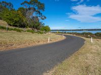 A picturesque coastal road winding through lush green vegetation and grassy plains, with a stunning view of the ocean and a pier in Bermagui, New South Wales, Australia.