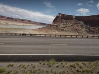 A road winds through the high desert landscape of Utah, USA, showcasing the stunning natural beauty of the mountain landforms and rugged terrain. The elevated highway offers a perfect mode of transport for a road trip adventure in this wild and remote wilderness.