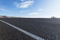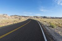 A sunny day in Utah's San Rafael Swell as a car drives down the asphalt road, surrounded by breathtaking red rock formations in Canyonlands National Park. The clear sky and low contrails add to the picturesque landscape.