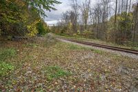 A picturesque forest path surrounded by lush vegetation and autumn leaves.