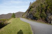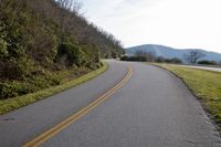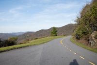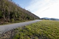A picturesque road winds through the highland hills, surrounded by lush vegetation and fields of grass on a sunny day.