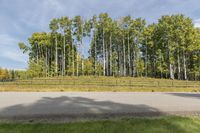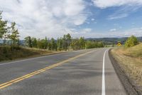 Aerial view of a lush green landscape with mountains, forests, and a straight road cutting through the wilderness in Alberta, Canada.