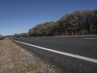 A picturesque view of a rural landscape with an asphalt road surrounded by trees and vegetation under a clear sky.
