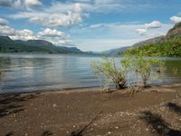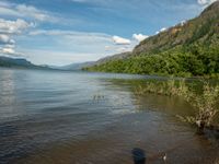 A stunning view of the natural environment in California, showing a lush vegetation, a serene lake, and majestic mountains in the background.