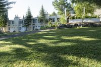 A beautiful view of a residential area in Toronto, Canada, surrounded by lush forests, green grass, and a serene lake. The open spaces and nature-filled surroundings make it an ideal place to call home.