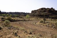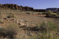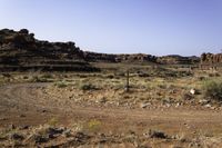 A stunning view of the Canyonlands in Utah, USA, showcasing the diverse plant community, vegetation, and bedrock formations amidst the red rock mountains and grassy slopes.