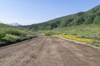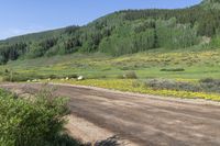 A picturesque scene in Washington Gulch, Colorado, showcasing lush vegetation, grassy slopes, and majestic mountains under a clear sky.