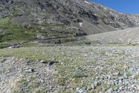 A scenic landscape in Colorado, USA, showing a dirt road winding through grassy hills and mountains under a clear sky.