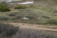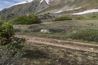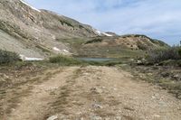 A stunning view of the rugged mountain terrain in Colorado, USA. The highland grass and vegetation cover the slopes, while a snow-capped mountain range stretches into the distance. Loveland Pass, elevated and surrounded by natural beauty, offers a straight road leading to Pass Lake, a tranquil water bank. The clouds dot the sky, creating a picturesque scene in this alpine biome.