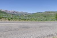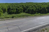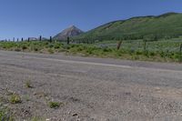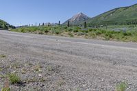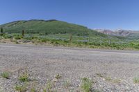 A breathtaking view of the scenic landscape in Crested Butte, Colorado, USA. The asphalt road winds its way through the mountainous terrain, surrounded by lush vegetation and towering trees. The clear blue sky and majestic mountains create a stunning natural environment for outdoor enthusiasts.