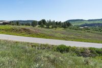 A breathtaking view of the lush green grass and open spaces in Deer Creek Canyon Park, located in Denver, Colorado under a clear sky with low clouds and contrails in the background.