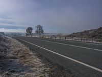 A gloomy day on a rural road in a scenic landscape with fog and a grey sky