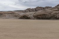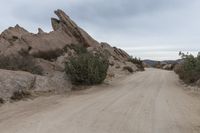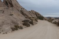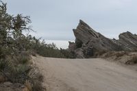 A rugged and gloomy natural environment in Los Angeles, California, USA, with mountains, cliffs, and rock formations surrounded by a low tree line and a straight road leading into the wilderness.