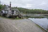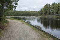 Aerial view of a gloomy day in Ontario, Canada. The landscape features lush vegetation, larch trees, and a winding road surface leading to a tranquil lake. The grey sky reflects on the calm water, creating a serene atmosphere.