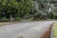 A breathtaking view of a lush green forest with a gravel road winding through it under a grey sky, creating a serene atmosphere on a sunny day