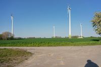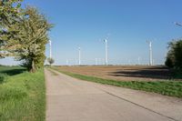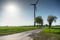 A beautiful day in rural Germany with an asphalt road leading through the picturesque landscape. A traditional windmill stands tall against the clear blue sky, while wind turbines harness the power of the gentle breeze. The golden sun shines brightly, casting a warm glow over the concrete street.
