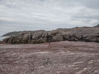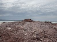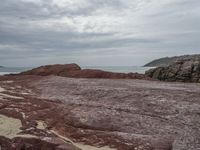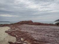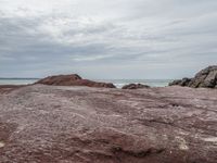 A rugged coastal terrain with bedrock cliffs and a cloudy grey sky, overlooking the beach at Pambula on the Sapphire Coast in New South Wales, Australia.