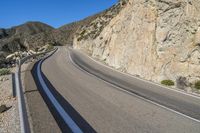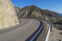 A picturesque view of Spain's winding coastal road against a backdrop of mountains, clear blue skies, and the sparkling ocean.