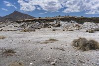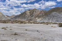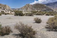 A picturesque view of the Tabernas region in Spain, showcasing its sandy desert terrain, majestic mountains, and vast open spaces under a clear sky.