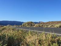 A stunning view of the Canary Islands, Tenerife, showcasing the diverse vegetation and plant community. The landscape features a road surface with asphalt stretching into the horizon, surrounded by mountain landforms. The clear sky adds to the beauty of this rural location in Europe's nature-rich national park. The grass-covered low mountains, with clouds hovering above, create a picturesque slope. The straight road, made of tar, leads through the plain, offering a mesmerizing journey through these elevated highlands.