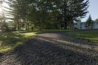 A beautiful view of a residential area in Toronto, Canada, surrounded by nature and open spaces. The lush green grass, trees, and lake create a serene ambiance, perfect for relaxation and recreation. The sunlight filters through the trees, casting shadows on the gravel path and adding a touch of magic to the scene. A perfect place to escape the hustle and bustle of the city and enjoy the tranquility of nature.